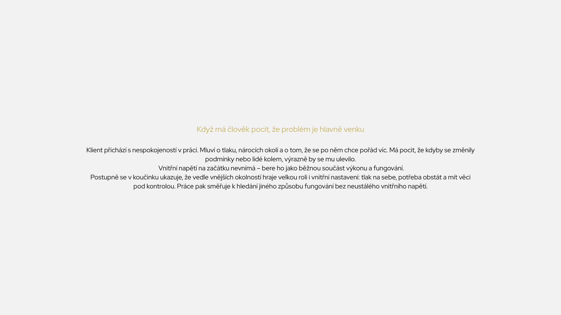 Postupně se v koučinku ukazuje, že vedle vnějších okolností hraje velkou roli i vnitřní nastavení: tlak na sebe, potřeba obstát a mít věci pod kontrolou. Práce pak směřuje k hledání jiného způsobu fungování bez neustálého vnitřního napětí.